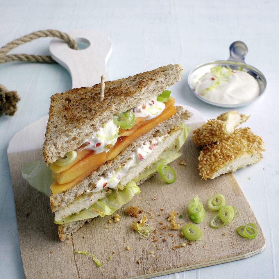 Vollkorn-Club-Sandwich mit Papaya und Limetten-Chili-Schmand