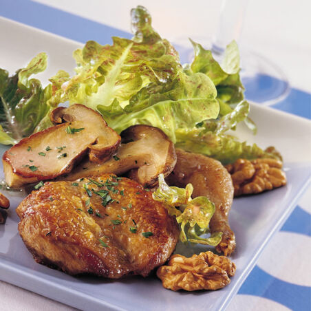 Die Wachteln herausnehmen und mit Alufolie abdecken. Den Salat mit der Vinaigrette in einer Schüssel mischen. Auf vier Tellern den Salat, die Pilze und die Wachtelbrüste und -keulen dekorativ anrichten. Mit den Walnusskernen und Petersilie bestreut servieren.