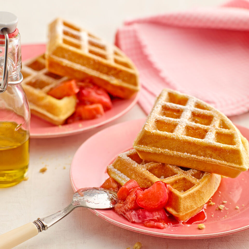 Die frisch gebackenen Waffeln werden mit selbst gemachtem Himbeer-Rhabarber-Kompott serviert. Einfach himmlisch gut!