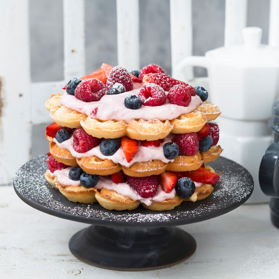 Ein verführerischer Traum aus Beeren und Sahne ist diese Schichttorte aus knusprig-süßen Herzwaffeln. Ideal für jede sommerliche Kuchentafel.