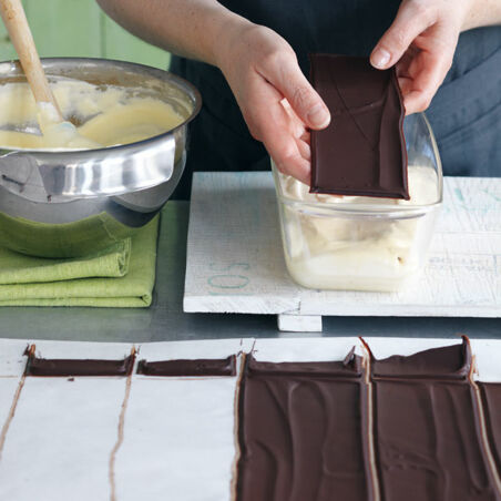 Schokolade hacken und in einer Schüssel über einem heißen Wasserbad unter Rühren schmelzen. Dann auf Backpapier zu einem Rechteck von ca. 60 x 28 cm verstreichen und mit einem Löffelstiel in sechs Streifen von ca. 10 x 28 cm einteilen. Schokolade fest werden lassen.
