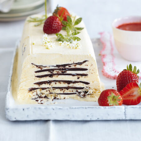 Etwas Parfaitmasse in einer Glasform (30 x 11 cm) verteilen und 1 Schokoladenplatte darauflegen. Die Masse und die Schokolade abwechselnd in die Form schichten, dabei mit Parfaitmasse abschließen. Das Parfait zugedeckt ca. 8 Std. in das Tiefkühlfach stellen.