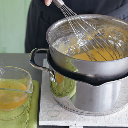 Die Limette heiß waschen und trocken reiben, die Schale abreiben und den Saft auspressen. Eigelbe, Zucker, 120 ml Sirup und Limettenschale in einer Metallschüssel über einem heißen Wasserbad mit dem Schneebesen schaumig aufschlagen. Die Masse im kalten Wasserbad unter Rühren abkühlen lassen. Die Sahne mit den Quirlen des Handrührgeräts steif schlagen und unter die Parfaitmasse heben.