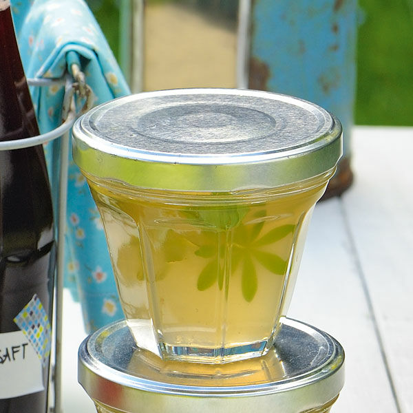 Das heiße Gelee in Gläser füllen, Waldmeisterblättchen zugeben. Glas verschließen, umdrehen und abkühlen lassen. Hält sich ca. 6 Monate.