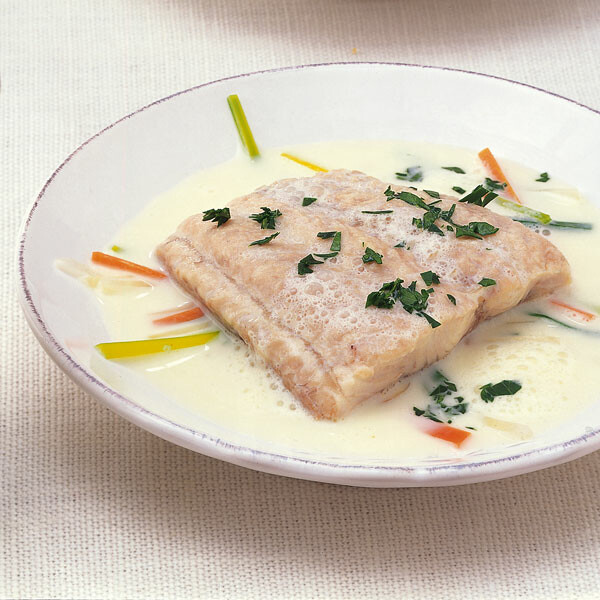 1 l Wasser mit Essig, Wein, 1 Prise Salz und Zucker zum Kochen bringen. Gemüse in das sprudelnd kochende Wasser geben, Fischfilet hineinlegen, bei sehr milder Hitze in 10 Min. gar ziehen lassen.