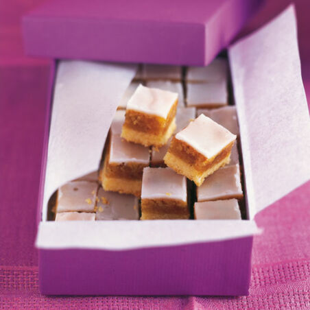 Restlichen Puderzucker mit Zitronensaft und 2 EL Wasser verrühren. Den Guss auf den warmen Kuchen streichen und auskühlen lassen. Die Ränder gerade abschneiden. Den Kuchen in ca. 2 x 2 cm große Quadrate schneiden. In einer Blechdose zwischen Schichten von Pergamentpapier aufbewahren. So halten sich die Würfel ca. 4 Wochen.