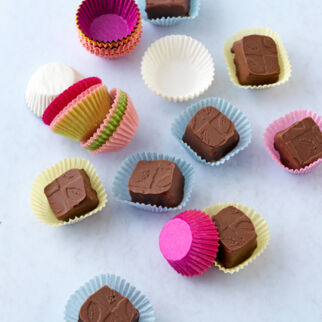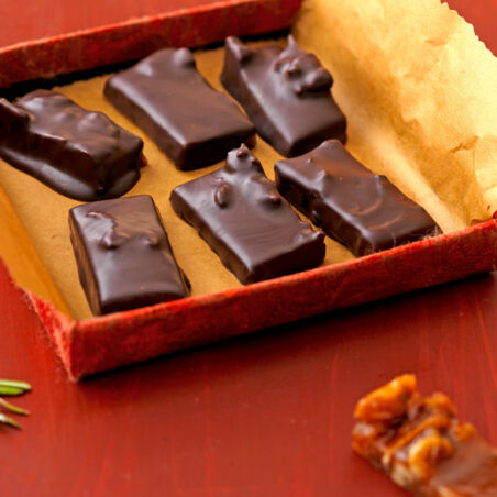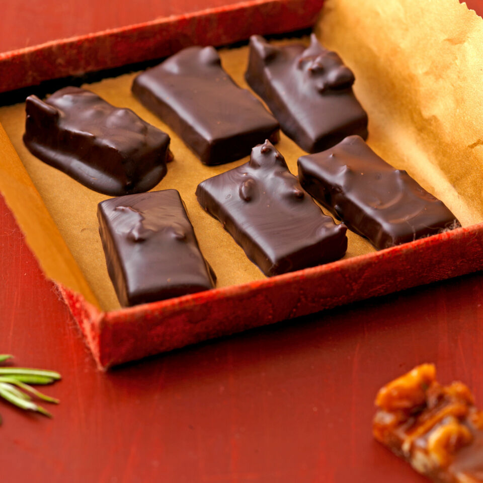 Die Masse in ca. 1 Std. vollständig auskühlen lassen. Krokant in 30 Rechtecke von etwa 2 × 3 cm Größe schneiden. Die temperierte Kuvertüre bereitstellen. Die Krokantstücke mit der Pralinengabel in die temperierte Kuvertüre tauchen und auf Butterbrotpapier ablegen.