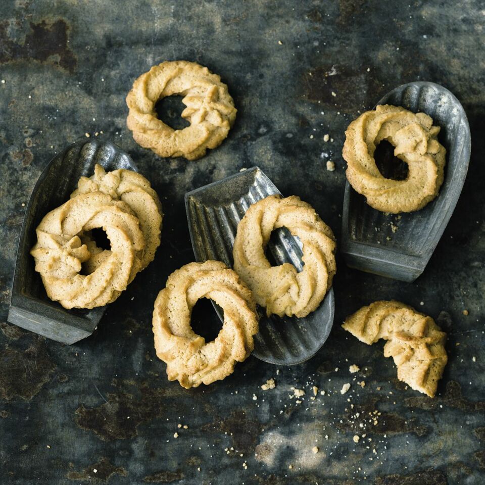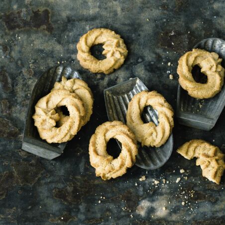 Den Teig in den Spritzbeutel füllen und mit etwas Abstand zueinander Kringel von ca. 5 cm Ø auf die Backbleche aufspritzen. Die Walnussringe im Ofen (Mitte) pro Blech 12-15 Min. backen. Herausnehmen, mit dem Backpapier vom Blech ziehen und auf einem Kuchengitter auskühlen lassen.