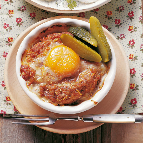 Die Förmchen einölen. Aus der Hackmasse 4 flache Fladen formen, in die Förmchen legen und in der Mitte jeweils eine Mulde eindrücken. Die Eier vorsichtig in die Vertiefungen aufschlagen. Die Eiweiße leicht salzen und pfeffern.