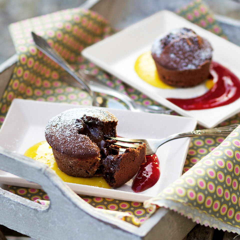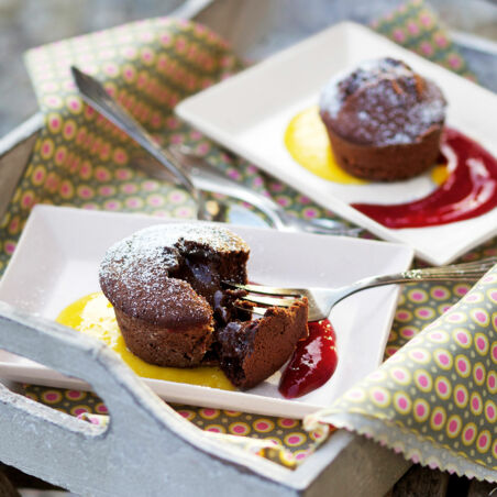 Die Schokoküchlein aus dem Ofen holen, aus den Förmchen stürzen und mit Mango- und Himbeersauce auf Desserttellern anrichten. Mit Puderzucker bestäubt sofort servieren, damit der Kern der Küchlein noch heiß ist.