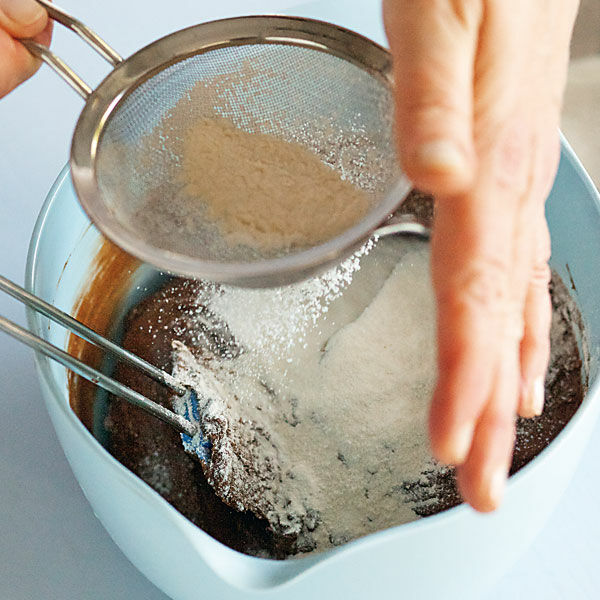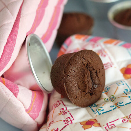 Die weiche Butter, 50 g Puderzucker und 1 kleine Prise Salz in eine Rührschüssel geben und mit dem Handrührgerät 2-3 Min. schaumig rühren. Die Eier nacheinander hinzufügen und unterschlagen. Die geschmolzene Schokolade unterrühren. Das Mehl daraufsieben und mit einem Teigspatel unterziehen. Den Teig auf die Förmchen verteilen und die Küchlein ca. 12 Min. im Ofen (Mitte) backen.