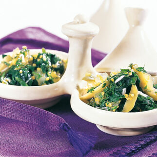 Paprika- und Auberginenwürfel mit der Hälfte der Petersilie in die Pfanne geben, untermischen und heiß werden lassen. Den Zitronensaft dazuschütten und das Gemüse mit Kreuzkümmel, Salz und Pfeffer würzen. Auf einer länglichen Platte verteilen. Restliche Petersilie und Sumach draufstreuen und den Salat warm servieren.