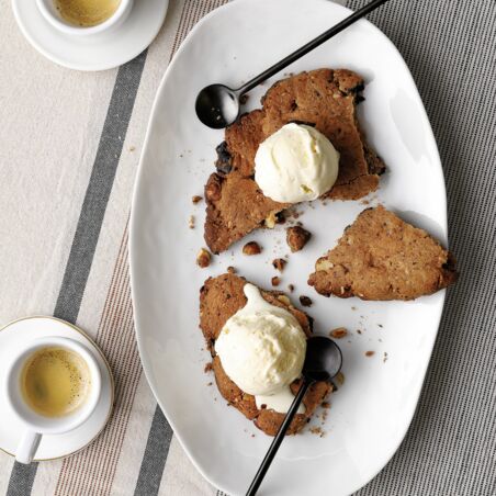 Haselnusskerne und Schokolade grob hacken und unter den Teig kneten. Den Teig auf einem mit Backpapier ausgelegten Backblech verteilen und mit den Händen zu einem Kreis (16 cm Ø) formen. Den Keks im heißen Ofen (Mitte) 12 Min. backen. Dann herausnehmen, in zwei Teile brechen und noch warm mit dem Eis auf zwei Tellern servieren.