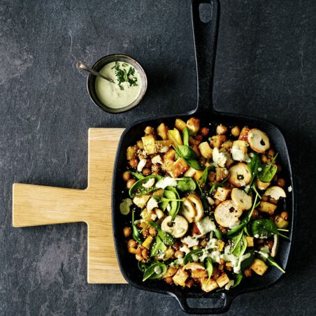 Bei diesem Kichererbsensalat ist das Team der Star: Warmer Salat, knusprige Brotchips und ein zitronig frisches Sesam-Dressing - einfach köstlich.