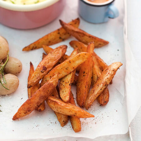 Die Kartoffeln abgießen und abtropfen lassen. Die Kartoffelspalten unter das gewürzte Öl mischen, auf dem Backblech verteilen und im Ofen (Mitte, Umluft 180°) ca. 30 Min. backen.