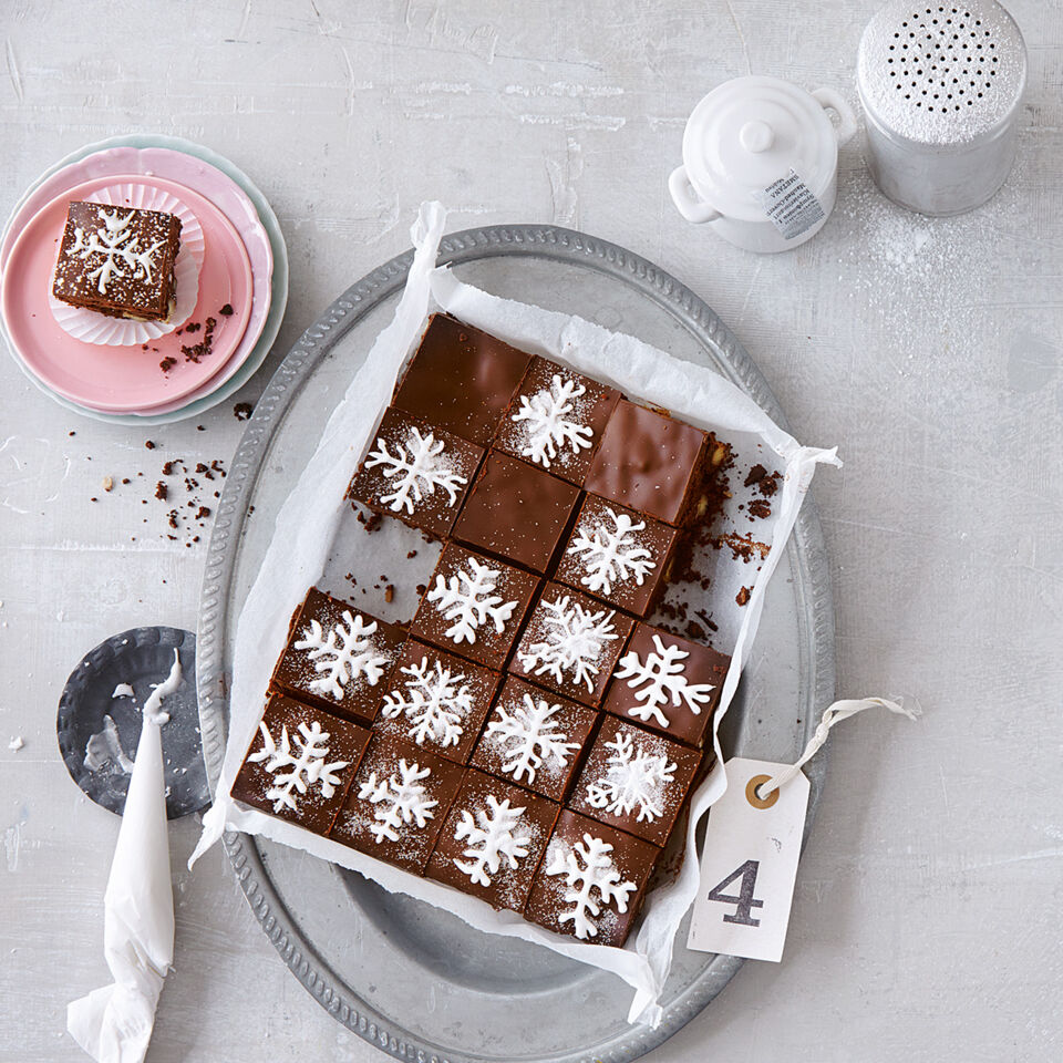 Zur Deko 50 g Puderzucker und 2 – 3 TL Zitronensaft zum Guss anrühren. In einen Papierspritzbeutel füllen, die Spitze abschneiden und Eiskristalle auf die Brownies malen.