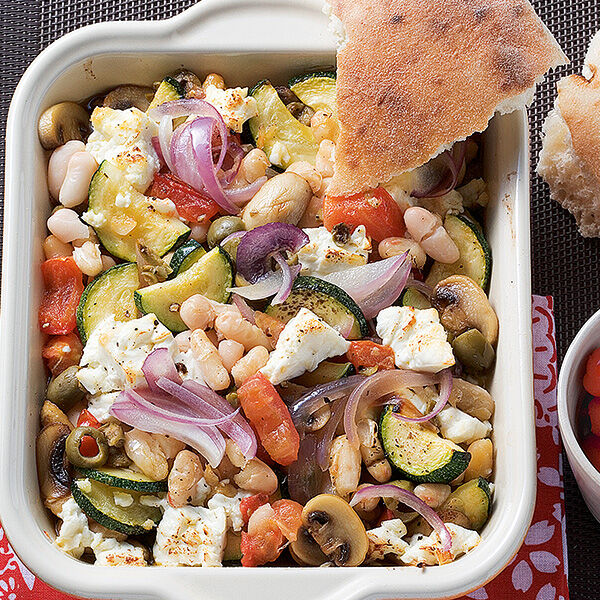Ein würziger Bohneneintopf aus dem Ofen, der mit Zucchini, Pilzen, Tomaten, Feta und Oliven Erinnerungen an Urlaub in Griechenland weckt.