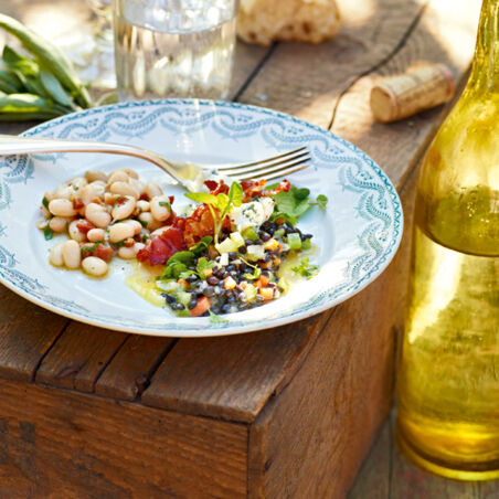 Die Bohnen 12 Std. oder über Nacht in reichlich kaltem Wasser einweichen. In ein Sieb abgießen, kalt abbrausen und mit 1,5 l Wasser in einen Topf geben. Knoblauch schälen, 2 Zehen halbieren und mit Lorbeerblatt und Speck zu den Bohnen geben. Thymian waschen und 4 Zweige dazugeben. Das Ganze einmal aufkochen, dann zugedeckt bei kleiner Hitze 70-90 Min. köcheln lassen, bis die Bohnen weich sind. Dabei, besonders zu Beginn, ab und zu mit einer Siebkelle den aufsteigenden Schaum abschöpfen. Gegen Garzeitende salzen und pfeffern.