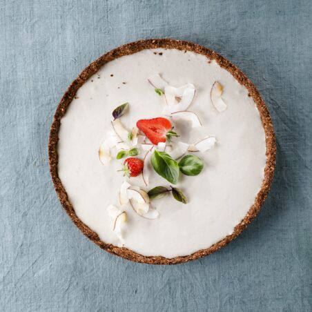 Die Füllung in den ausgekühlten Boden geben, gleichmäßig verteilen und glatt streichen. Die Tarte mindestens 3 Std. (am besten über Nacht) kalt stellen. Zum Servieren nach Belieben mit Kokoschips, Basilikumblättern und halbierten Erdbeeren dekorieren.