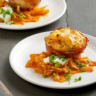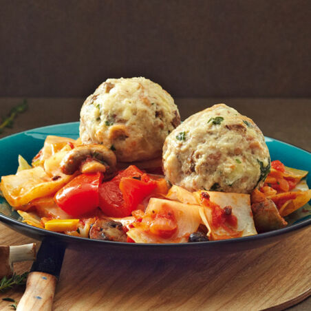 Inzwischen in einem großen Topf reichlich Wasser zum Kochen bringen und salzen. Den Käse entrinden, in 5 mm große Würfel schneiden und unter die Knödelmasse mischen. Mit angefeuchteten Händen 8 Knödel formen und ins kochende Salzwasser geben, die Hitze reduzieren und die Knödel im leicht siedenden Wasser in ca. 15 Min. gar ziehen lassen. Mit dem Schaumlöffel herausheben und abtropfen lassen. Das Krautgulasch auf Teller verteilen und mit den Pilzknödeln servieren. Wer mag, gibt noch jeweils 1 Klecks cremig gerührte saure Sahne auf das Gulasch.