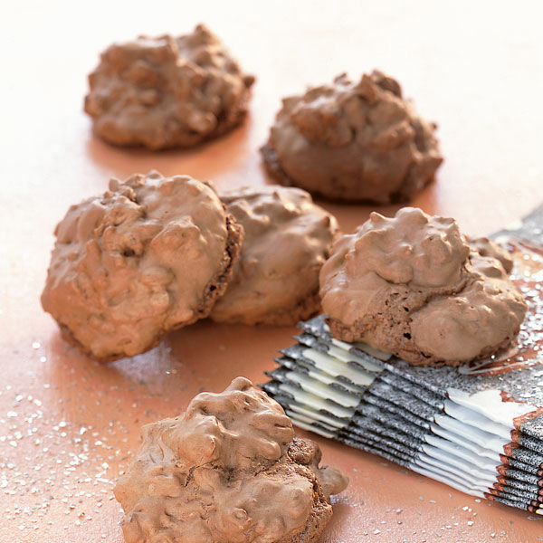 Eiweiße, Salz und Zucker im Wasserbad dickschaumig aufschlagen. Die gerösteten Mandeln und die Schokolade locker unterheben. Mit 2 Teelöffeln kleine Teighäufchen aufs Blech setzen. Im Ofen bei 140° (Mitte, Umluft 120°) ca. 25 Min. backen. Den Ofen ausschalten und die Plätzchen bei leicht geöffneter Backofentür noch 1 Std. trocknen lassen.