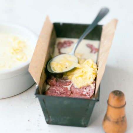 Ofen auf 180° vorheizen. Eine Kastenform (ca. 25 cm Länge) mit Backpapier auslegen. Gekochte und rohe Kartoffeln, Milch, Schmand und Eier zu einem dickflüssigen Teig vermischen, salzen und pfeffern.