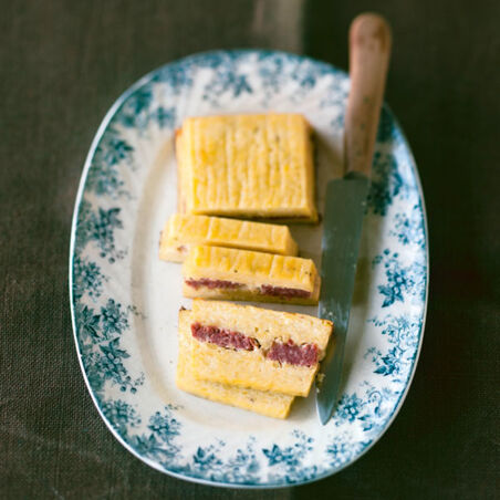 Die Masse zur Hälfte in die Form füllen, die Würste ganz oder in Scheiben geschnitten darauflegen und die übrige Masse darüber verteilen. Die Form mit dem Boden mehrmals auf den Tisch stoßen, damit der Teig sich setzt. Potthucke 1 Std. 10 Min.-1 Std. 30 Min. im heißen Ofen (Mitte, Umluft 160°) garen, bis sie gestockt und ihre Oberfläche leicht gebräunt ist.