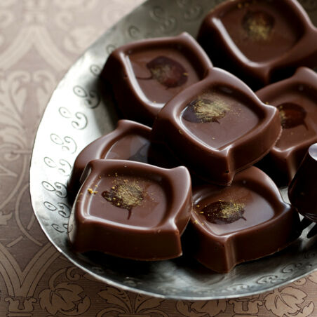 Zartbitterkuvertüre hacken, schmelzen, temperieren. In jede Mulde mit einem Pinsel etwas Kuvertüre tupfen, fest werden lassen. Vollmilchkuvertüre hacken, schmelzen, temperieren. Mulden damit ausgießen, überschüssige Kuvertüre ausgießen. Ca. 2 Std. fest werden lassen.
