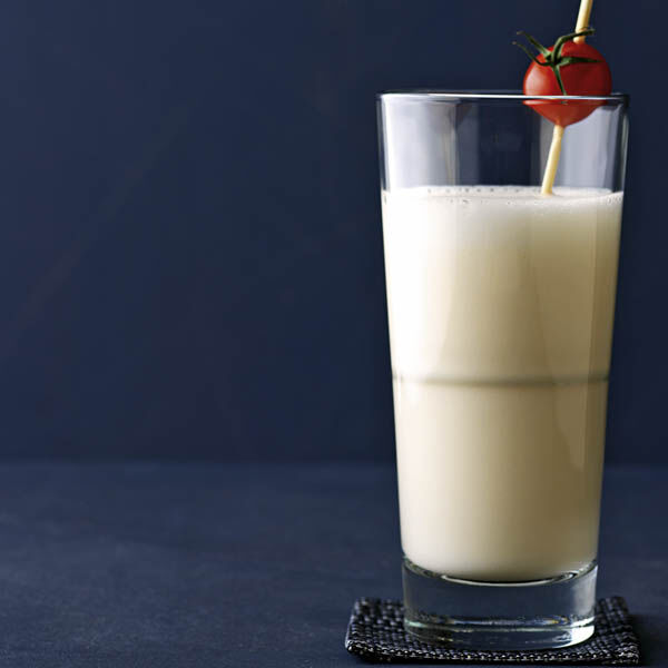Den Inhalt des Rührglases durch das Barsieb in das Longdrinkglas gießen. Die übrige Tomate einschneiden und an den Glasrand stecken. Den Drink sofort servieren.