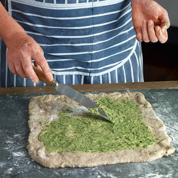 Den Teig auf der bemehlten Arbeitsfläche zu einem Quadrat von ca. 30 cm ausrollen. Die Füllung daraufstreichen, dabei ringsum einen etwa 3 cm breiten Rand frei lassen. Den Teig aufrollen und mit der Naht nach unten auf ein gefettetes Blech setzen. Mit der Schere von oben im Abstand von 1 cm den Teig tief ein-, aber nicht durchschneiden. Die entstandenen Teigscheiben abwechselnd nach rechts und nach links auseinanderschieben. Das Brot zugedeckt ca. 2 Std. warm ruhen lassen, bis sich das Volumen verdoppelt hat.