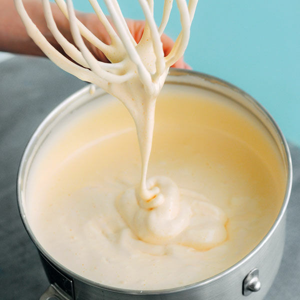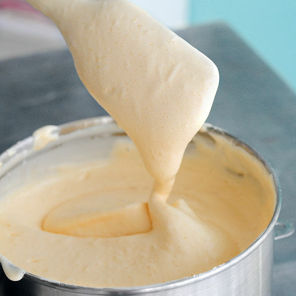 Die Schüssel vom Wasserbad nehmen und die Masse mit den Schneebesen der Küchenmaschine oder des Handrührgeräts ca. 10 Min. aufschlagen. Die Masse sollte dann nur noch lauwarm sein, eine hellgelbe Farbe besitzen und stark an Volumen zugenommen haben.