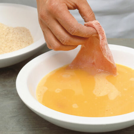 Die Schnitzel mit Küchenpapier trockentupfen und leicht klopfen, sie sollen überall ca. ½ cm dick sein. Eventuell den Rand mit einem scharfen Messer mehrmals leicht einkerben, damit sich die Schnitzel beim Braten nicht wölben. Mit wenig Salz und Pfeffer würzen.