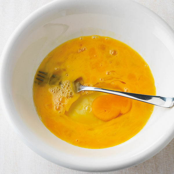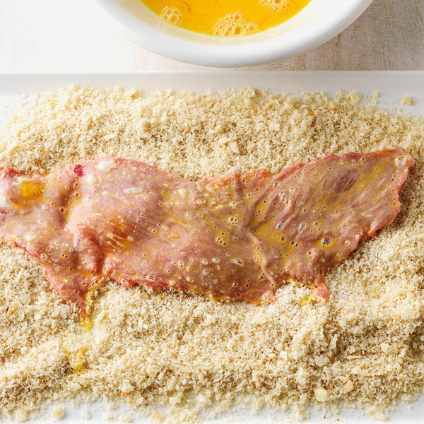 Das Mehl in eine flache Schale geben. Die Eier in einer weiteren Schale »schlampig verrühren«, d. h. ohne dass sich Eigelb und Eiweiß ganz vermischen. Die Semmelbrösel in eine dritte Schale füllen.