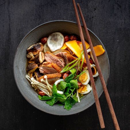 Mit Wachtelei, Wildentenbrust, Enoki- und Shitake-Pilzen, Topinambur, Sellerie, Udon Nudeln, Hokkaido, Thymian und Haselnuss.