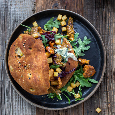 Mariniertes Wildentenfleisch, frittierte Kartoffelwürfel, Zwiebelmarmelade, Rucola-Salat, Rotkrautsalat, Cranberry-Raita, Pfifferlinge und selbstgemachtes Nuss-Fladenbrot.