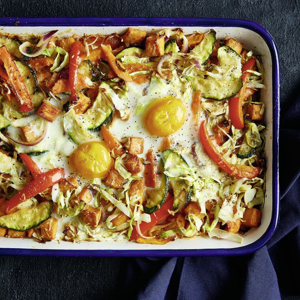 Gutes Essen kann so einfach sein. Den Beweis liefert dieser ruck-zuck Auflauf mit aromatischem Gemüse. Zur Krönung kommen noch Spiegeleier obendrauf.