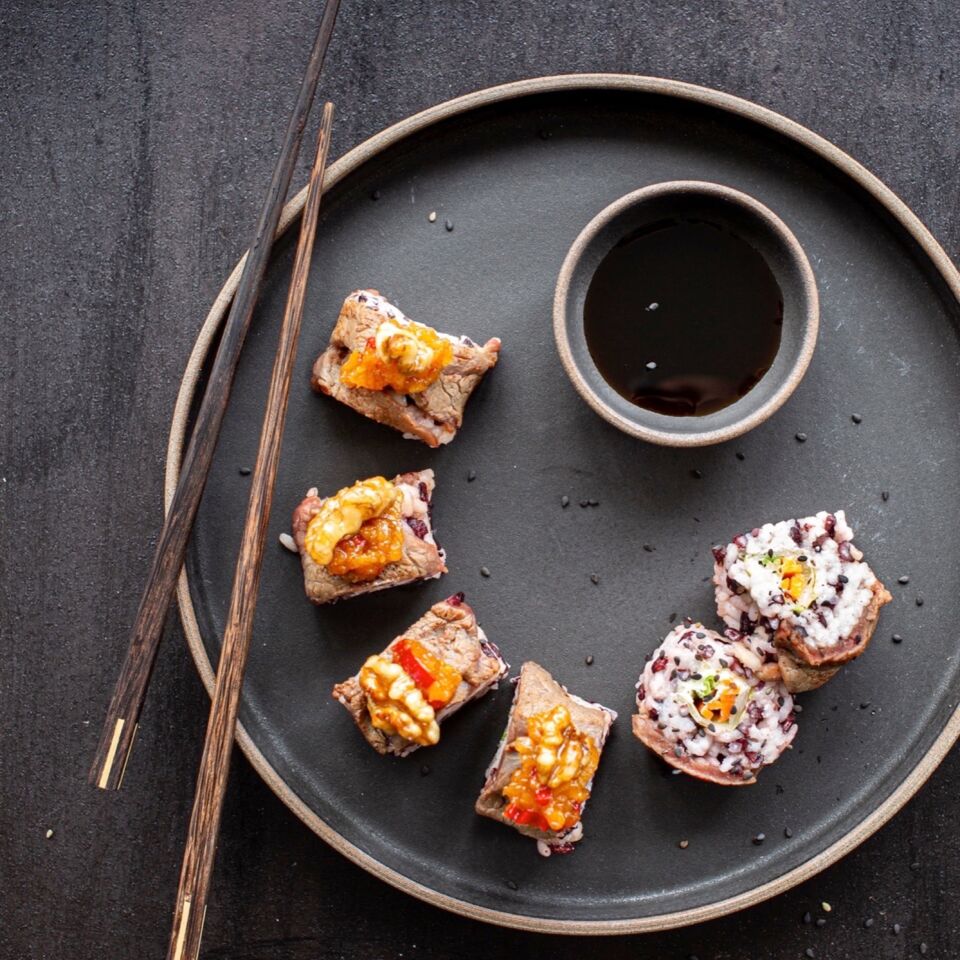 Wildes Sushi mit geflämmtem Hirsch