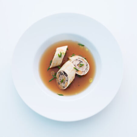 Wildessenz mit Waldpilz-Crêpesröllchen