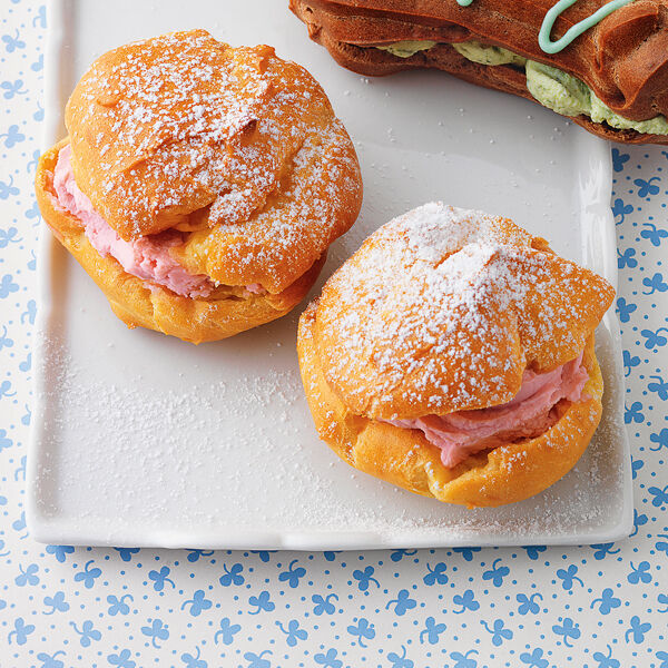 Aus ¼ l Wasser, Butter, Salz, Vanillezucker, Mehl und Eiern wie links beschrieben eine Brandmasse herstellen. Den Backofen auf 180° vorheizen. Zwei Backbleche mit Backpapier belegen. Ca. 50 gut walnussgroße Häufchen mit etwas Abstand auf die Bleche spritzen. Nacheinander im Ofen (Mitte, Umluft nicht geeignet) 20-25 Min. backen. Dann herausnehmen; sofort mit einer Schere aufschneiden und auskühlen lassen. Beerencreme mit einem Teelöffel oder einem Spritzbeutel mit Sterntülle in die Windbeutel füllen. Mit Puderzucker bestäuben.