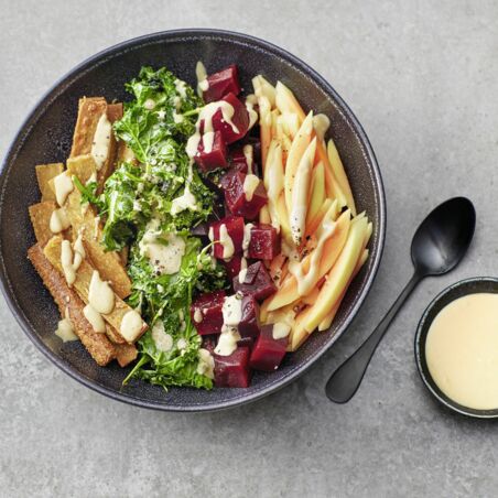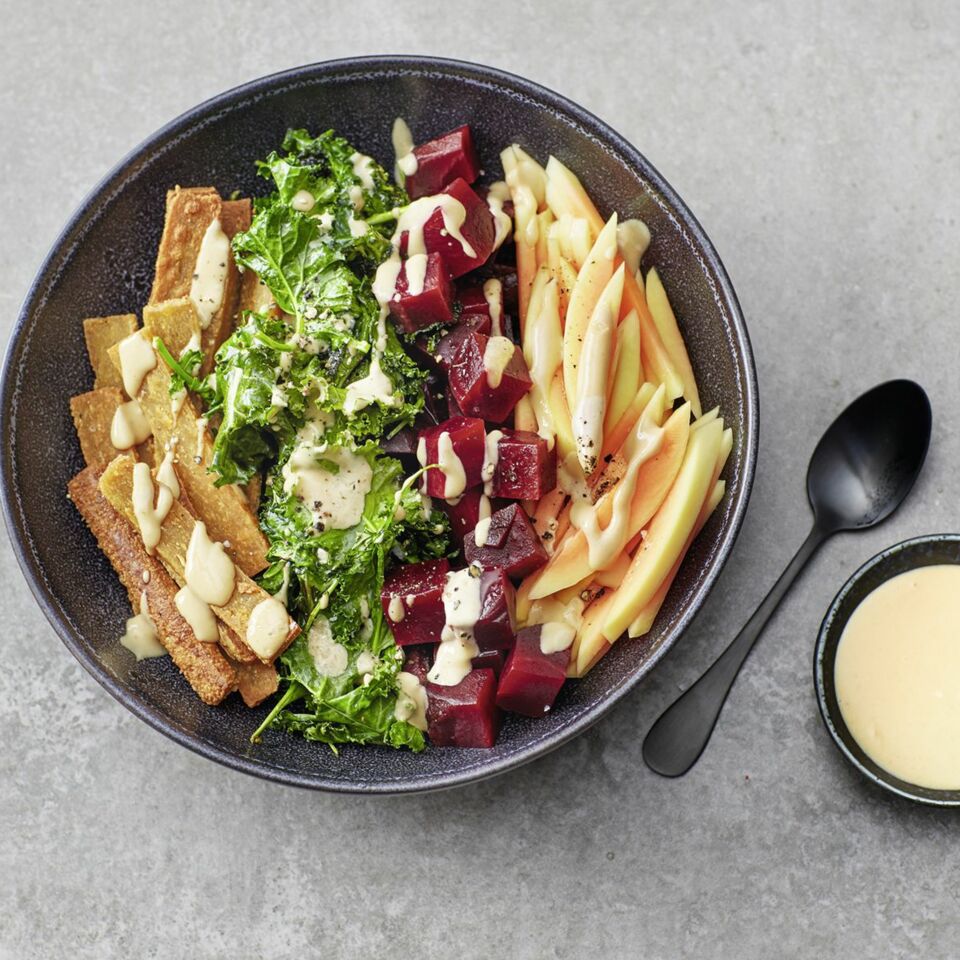Lust auf ein Low-Carb-Mittagessen? Diese farbenfrohe Veggie Bowl mit winterlichen Zutaten á la Grünkohl und Rote Bete macht deinen Alltag gleich viel bunter.
