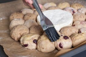 Den Ofen auf 200°C, Ober- und Unterhitze vorheizen. Eigelb und Milch miteinander verquirlen. Die Brötchen damit bestreichen und 25–30 Minuten im heißen Ofen backen.