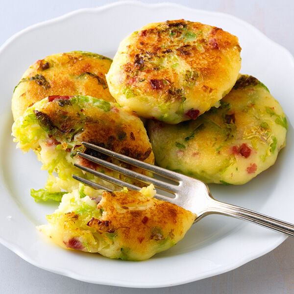 Kartoffeln waschen, in wenig Wasser in ca. 25 Min. garen, abgießen. Wirsing von Strunk und Rippen befreien, Blätter in Streifen schneiden, 2 Min. in Salzwasser blanchieren und abgießen. Zwiebel abziehen, Speck und Zwiebel würfeln, in 1 EL Öl 4 Min. anbraten. Wirsing zugeben, offen bei mittlerer Hitze 5 Min. dünsten. Mit Salz, Pfeffer und Muskatnuss würzen. Kartoffeln pellen, durch die Kartoffelpresse drücken, mit Ei und Wirsing mischen. Etwas Öl in einer beschichteten Pfanne erhitzen. Mit nassen Händen Küchlein formen und portionsweise pro Seite 3 Min. in heißem Öl braten.