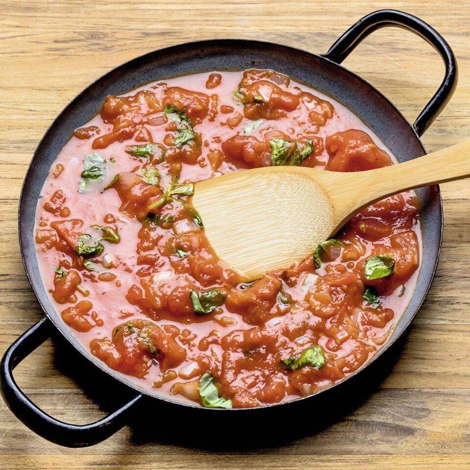 Achtung, nichts für Kinder! Diese Tomaten-Sahne-Sauce beommt einen ordentlichen Schuss Alkohol ab.