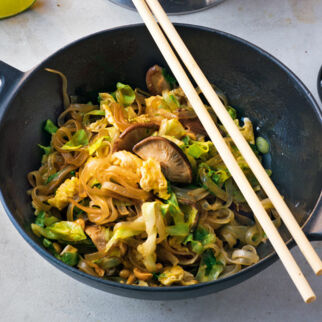 Den Wok erhitzen und die Hautstreifen darin bei mittlerer Hitze ausbraten; herausnehmen und auf Küchenpapier beiseitelegen. Die Entenscheiben kurz in dem Fett anbraten, herausnehmen und ebenfalls beiseitelegen. Nudeln in den Wok geben und ca. 2 Min. braten.