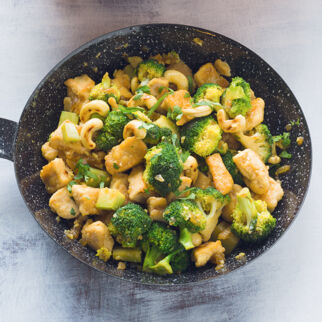 1 EL Öl im Wok erhitzen, Cashewkerne kurz darin anrösten, bis sie duften. Herausnehmen. Äpfel, Rotkohl und Ingwer zugeben. Das Ganze salzen und pfeffern und unter Rühren ca. 10 Min. braten. Dabei noch etwas Öl zugeben.