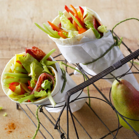 Den unteren Rand der Tortillafladen nach oben über die Füllung schlagen und die Fladen von einer Seite her aufrollen. Zum Mit nehmen die Wraps fest in Frischhalte folie wickeln. Die Birnen waschen und anschließend als Nachtisch essen.