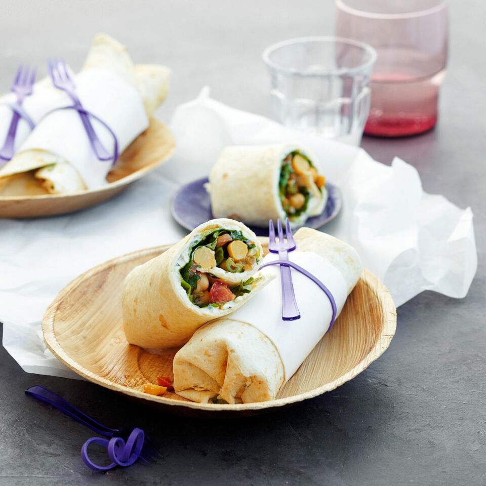 Diese Wraps lassen sich gut vorbereiten und sind ideal zum Mitnehmen. Einfach straff in Frischhaltefolie wickeln und reinbeißen, wann und wo es passt!