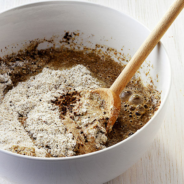 Am Vortag das Roggenvollkornmehl mit Roggenschrot, Sauerteig, knapp ½ l lauwarmem Wasser, Brotgewürz und Salz in einer Schüssel zu einem weichen Teig verrühren. Zugedeckt 18-22 Std. gut warm (mindestens 20°) gehen lassen.