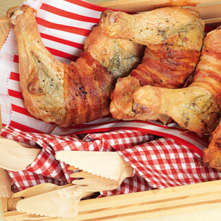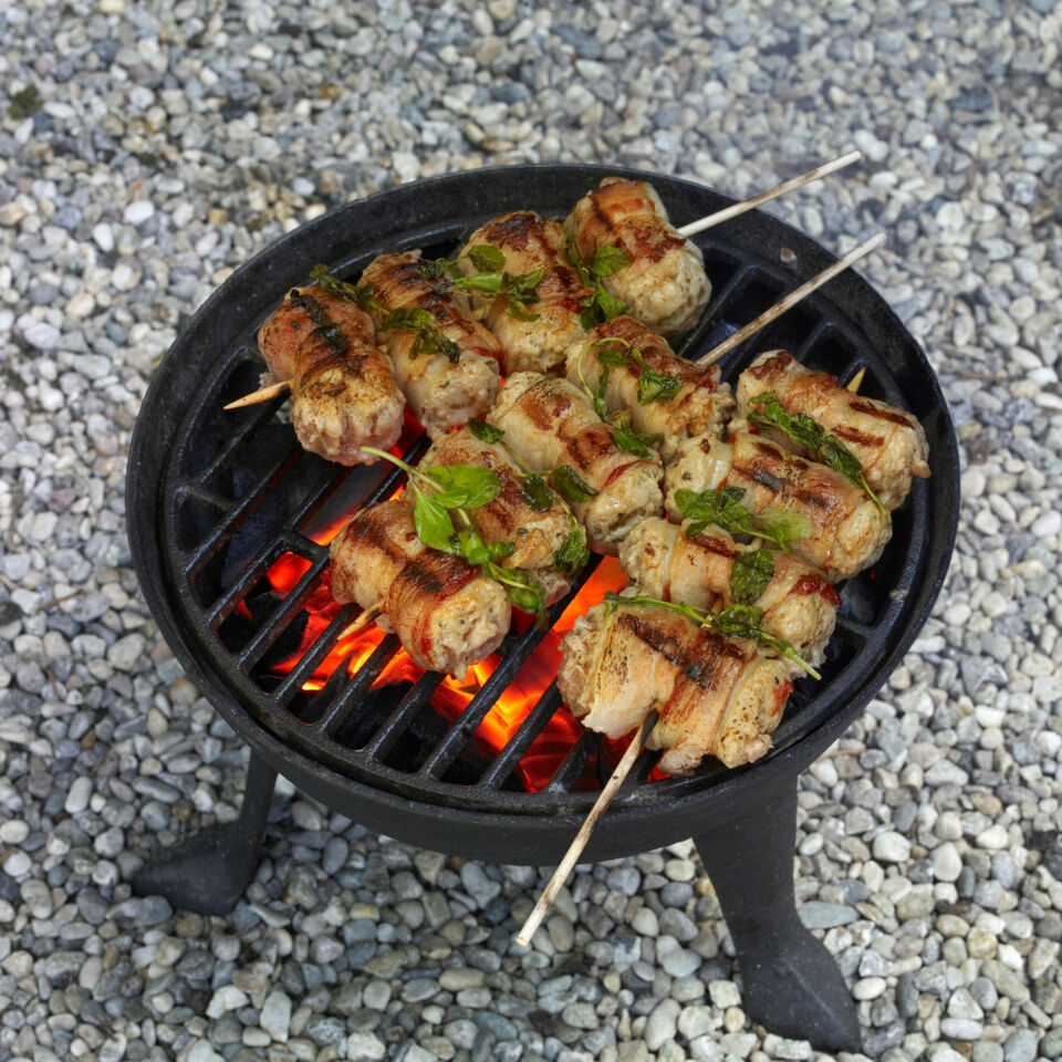 Würzig marinierte, saftige Würstchen mit krossem Speck - etwas für Auge und Gaumen.