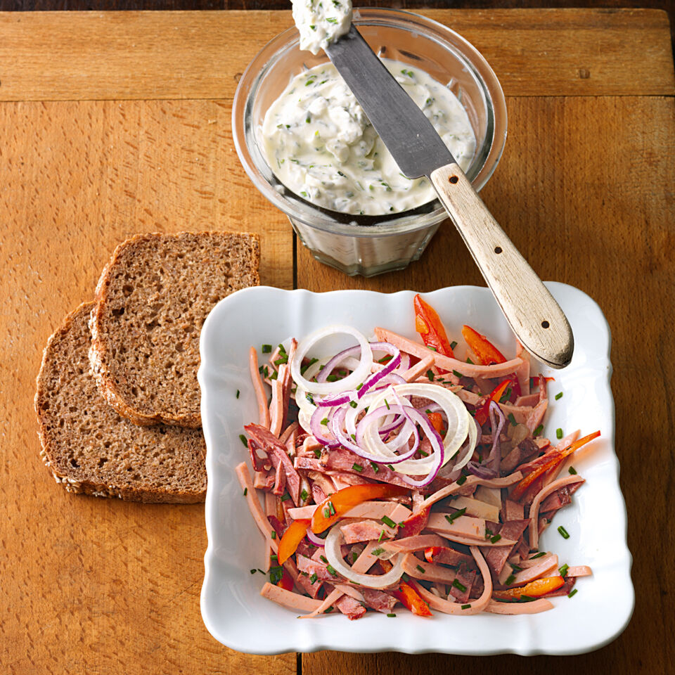 Im Schwabenlande genießt man den Wurstsalat besonders herzhaft - zur Fleischwurst gesellen sich noch Schwartenmagen und Zungenwurst.